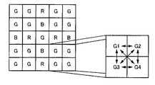 この発明によれば、前記第1の配列又は第2の配列を中心に5×5画素(モザイク画像の局所領域)を抽出した場合、前記5×5画素の4隅に2 ×2画素のG画素が存在することになる。これらの2 ×2画素のG画素の画素値は、4方向の相関方向の判別に使用することができる。 According to the present invention, when 5 × 5 pixels (local area of the mosaic image) are extracted centering on the first array or the second array, 2 × 2 pixels G are extracted at the four corners of the 5 × 5 pixels. There will be pixels. The pixel values of these 2 × 2 G pixels can be used to determine the correlation direction in the four directions.