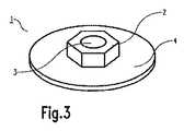 本発明による仕上げ要素の第一の代表的な実施形態は、それぞれ正面図、平面図、斜視図である図1ないし図3に示されている。図1に示されているように、仕上げ要素1は、その下側でリム4に液密に連結され相対的に形状を維持するコア体2を有しており、該リム4は、コア体の周囲で側方へ延出している。コア体2は、さらに図2で見られるように孔部3が中央に形成されている。外ねじ部が外端に形成された構造物要素に、耐久性および信頼性をもって仕上げ要素を取り付けることを可能とするために、コア体2は上記外端の外ねじ部に対して相補的な内ねじ部を孔部3内に有している。孔部内において、コア体には、ねじ部が十分にシールされていないときに該ねじ部を経て孔部3に液体が浸入することを防止するための液状バリアとしてゴム製のシールリングが配される溝部が形成されているようにすることもできる。シールリングに代えて、例えばテープ、特に絶縁テープ、液密ペーストあるいは硬化性樹脂製のバリアのような他の液状バリアを、孔部内に適用することも可能である。形態を維持するコア体2の形状、材料および大きさは、要求に応じて変更可能であるが、第一の代表的な形態では、安価で広く入手可能な商品であるナットを用いることとする。耐久性および信頼性の観点から、上記ナットはステンレス鋼製とする。リム4は、ビチューメンあるいはプラスチックの壁表面材、特にビチューメンあるいはプラスチックの屋根表面材の比較的可撓なリム体を有している。可撓なリム体4の中央部は、固着剤、特に適したタイプの接着剤によってコア体2に液密に接着されている。  A first exemplary embodiment of a finishing element according to the present invention is shown in FIGS. 1 to 3 which are a front view, a plan view and a perspective view, respectively. As shown in FIG. 1, the finishing element 1 has a