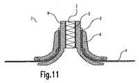 図11は、本発明による第三の代表的な実施形態を示す正面図である。仕上げ要素1は、第一コア部8および第二コア部9をもつコア体2を有しており、該コア体2は、第一コア部8の内ねじ部と、これに相補的な第二コア部9の外ねじ部とによって、互いに螺合可能となっている。第一コア部8は、第二コア部9へ手作業で螺合締結できるが、さらに強くそして信頼性をもつ締結を可能とするために、コア部8は、適切な補助工具によって、結合のための凹部が形成された外端の基部の近傍にもたらされる。第二コア部9は、相補的な外ねじ部が形成された構造物要素の自由外端への取付けのために、孔部内に内ねじ部が形成されている。仕上げ要素1を比較的軽量とするために、コア部8,9はアルミニウムで作られている。可撓なリム体4は、二つのコア部の間に位置して両コア部で締め付けられる中央部と、対象物の表面へ液密に固着される、横方向への延出部分を有している。液体に対する追加的なバリアを成すように、コア部8,9およびリム体4の中央部は、仕上げ要素1が接着された表面に対して上方へ向け湾曲している。コア部8,9は湾曲しているので、可撓なリム4に影響を及ぼすような鋭いエッジは形成されない。軽量で非常に信頼性の高い仕上げ要素1はこのようにして提供され、実質的にシャンク状の自由外端を有する構造物要素の該自由外端は、仕上げ要素1が比較的短期間で液密に取り付けられる。このようにして、液体が構造物要素の周囲の隙間から対象物へ浸入することが防止される。  FIG. 11 is a front view showing a third exemplary embodiment according to the present invention. The finishing element 1 has a