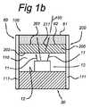 図1bは、薄いホイルにコーティングされた又は発光セラミックに含まれる発光材料部205のような熱的に変化する反射素子60の下流に配された発光材料層200を有する実施の形態を模式的に表している。また、壁部111が光源10を取り囲んでいる。支持体20、壁部111及び発光材料層200は、光チャンバ110を与えている。これは、光源10の光11と発光材料部205の発光材料光211とを混合するために用いられる。壁部111及び底面12は、MCPETを有する反射コーティングのような反射材料を好ましく備えている。上記壁部及びチャンバは、任意である。ここでは、発光材料部205は、光源10から離れて(すなわち、ゼロではない距離で)配されている。  FIG. 1b schematically illustrates an embodiment having a