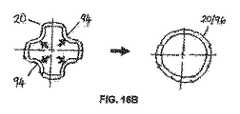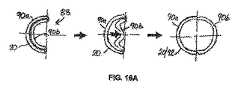 瘻孔アダプタ20が、硬質または少なくとも半硬質である場合、腸内への近位端22の導入は、瘻孔アダプタ20の長さに沿って、1つ以上の位置において、ある程度の腸の半径方向伸張またはコンプライアンスを必要とする可能性がある。図16Aおよび16Bは、瘻孔アダプタ20の導入中の腸のコンプライアンスまたは伸張量を最小化(または、少なくとも低減)するために採用され得る、折り畳み断面構成の概念を示す。バイステイブル断面88を生成することによって、瘻孔アダプタ20の近位端22をその折り畳み構成により容易に導入し、次いで、挿入後、その最終構成に拡張可能である。一実施形態(図16A)では、瘻孔アダプタ20の折り畳み構成は、断面における、2つの隣接する半円形形状90aおよび90bである。挿入されると、瘻孔アダプタ20は、瘻孔アダプタが、導入後、断面において、完全ループ92(例えば、円形)に拡張するまで、内側半円形形状90bを外側に駆動することによって、拡張される。別の実施形態(図16B)では、瘻孔アダプタ20の折り畳み構成は、縦溝のついた断面を有し、縦溝断面またはチャネル94は、瘻孔アダプタ20の全体直径を低減させる。挿入後、縦溝断面は、その最終円形形状96に拡張される。 If the