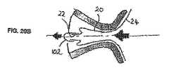 図15A、15B、および15Cを参照すると、別の実施形態では、螺旋形バネ80を使用して、軸方向力に対する適切なレベルの抵抗を付与する一方、高レベルの半径方向のコンプライアンスを可能にする。一形態では(図15A)、バネ80は、本質的に、機械的であって、すなわち、金属またはポリマー等の弾性材料から形成される。別の形態では(図15Bおよび15C)、バネ80は、螺旋形状を伴う、可撓性チューブ82から形成される。可撓性チューブ82は、図14Aおよび14Bのチューブ76と同様に、瘻孔アダプタ20に付着される、またはその中に組み込まれる。可撓性チューブ82は、非膨張時、本来の強度を有さないであろう(図15B)。膨張ポート84を通して、所望の膨張圧に膨張時(図15C)、可撓性チューブ82は、所望のレベルの軸方向剛性を呈し、半径方向のコンプライアンスも維持する。 Referring to FIGS. 15A, 15B, and 15C, in another embodiment, a helical spring 80 is used to provide an appropriate level of resistance to axial forces while allowing a high level of radial compliance. To do. In one form (FIG. 15A), the spring 80 is mechanical in nature, ie formed from an elastic material such as a metal or polymer. In another form (FIGS. 15B and 15C), the spring 80 is formed from a