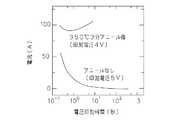 図5に示すように、上部電極20を形成する前に酸素中で酸化物イオン伝導層21に350℃30分のアニールを行ったスイッチング素子の過渡電流は、4Vの定電圧印加時に1秒程度の間電流が減少し、その後増加に転じている。つまり、4Vの定電圧印加時に1秒程度イオン電流が観測される。一方、上記アニールを行っていないスイッチング素子の過渡電流は、5Vの定電圧印加時に500秒以上の間、イオン電流が観測されている。イオン電流が観測されている時間は、金属イオンが供給し終わるまでの時間、すなわち金属イオンの拡散速度に関係していることから、酸化物イオン伝導層21にアニールを行うことで酸化物イオン伝導層21中での金属イオンの拡散速度が増加していることがわかる。 As shown in FIG. 5, the transient current of the switching element obtained by annealing the oxide ion conductive layer 21 in oxygen at 350 ° C. for 30 minutes before forming the upper electrode 20 is about 1 second when a constant voltage of 4 V is applied. During this period, the current decreases and then increases. That is, an ion current is observed for about 1 second when a constant voltage of 4 V is applied. On the other hand, as a transient current of the switching element not subjected to the annealing, an ionic current is observed for 500 seconds or more when a constant voltage of 5 V is applied. Since the time during which the ionic current is observed is related to the time until the metal ions are completely supplied, that is, the diffusion rate of the metal ions, the oxide ion conductive layer 21 is annealed to conduct oxide ion conduction. It can be seen that the diffusion rate of metal ions in the layer 21 is increased.
