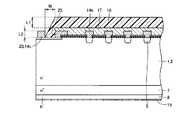 また、図12に示すように、半絶縁性シリコン窒化膜17の上面上に位置するオーバーコート膜18の膜厚をL1、段差部20としてのAlSi層14cの高さをL2、最外周に位置するAlSi層の部分とAlSi層14cとの間に形成される溝25の幅をWとすると、オーバーコート材がチップの外側へ流れ出るのを阻止するには、次の関係式、