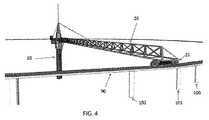 枠構築工程(90)は、方位角モーターを初期位置に戻すことから始まる(91)。初期位置は任意の位置であるが、一旦選ばれたら、構築工程の間中、初期位置として用いられなければならない。この位置において、トロリーは、水平ジブの先端まで移動させられる(92)。この段階で、杭打ち機が起動され、枠支持杭が地面に打ち込まれる(93)。杭の打ち込み工程が終了すると、方位角モーターが起動し、方位角度が予め定められた量だけ増加される(94)。水平ジブは、これで異なる場所に向けられる。この新たな位置で、杭の打ち込み工程が繰り返される(93)。初期位置に再び達するまで、この工程が何度も繰り返される(95)。この工程が終了すると、枠支持杭は全て地面に打ち込まれ、レール枠が枠支持杭の上に設置される。これで、水平ジブの先端を、レール枠により下側で支えることができる。 The frame construction process (90) begins by returning the azimuth motor to the initial position (91). The initial position is arbitrary, but once chosen, it must be used as the initial position throughout the construction process. In this position, the trolley is moved to the tip of the horizontal jib (92). At this stage, the pile driver is activated and the frame support pile is driven into the ground (93). When the pile driving process is completed, the azimuth motor is activated and the azimuth angle is increased by a predetermined amount (94). The horizontal jib is now directed to a different location. At this new position, the pile driving process is repeated (93). This process is repeated many times until the initial position is reached again (95). When this step is completed, all the frame support piles are driven into the ground, and the rail frame is installed on the frame support piles. Thus, the tip of the horizontal jib can be supported on the lower side by the rail frame.