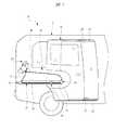 一方、スライドドア14の車両後方側の上下方向略中央部にはローラユニット16が設けられている。ローラユニット16は、スライドドア14のドアパネル(図示省略)に固定されたブラケット17に回動軸18を介して取り付けられるセンタアーム19を備えている。センタアーム19は、軸方向を車両上下方向に向けて配置された回動軸18により、スライドドア14に対して水平方向に回動自在に支持されている。センタアーム19には、センタレール15へ向けて屈曲するローラ装着部19aが設けられており、ローラ装着部19aに走行ローラ20と一対の案内ローラ21とが回転自在に取り付けられている。これら走行ローラ20および案内ローラ21がセンタレール15内に配置されて、走行ローラ20がセンタレール15の車両下方向の面を走行するとともに案内ローラ21がセンタレール15の車幅方向の両面に支持されて案内されることで、センタアーム19はセンタレール15に移動自在に装着されている。  On the other hand, a