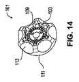 一実施形態において、ノブ101は、図11から図14に示すように、2つの部品、内側部材109及び外側部材111で形成されている。歯部103は、内側部材109に形成されている。ギザギザ部または節部113は、ノブ101に形成されており、把持を容易にする。  In one embodiment, the