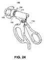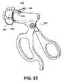 さまざまなタイプのロック機構(例えば、自己ロックする回転ノブ、回転ノブと組み合わされるスライドロック部)がちょうど説明されている一方、当然のことながら、任意の適切なロック機構は、本明細書で説明された回転ノブ及び手術器具と共に使用されてもよい。例えば、回転ノブと組み合わせて使用されるスライドロックの1つの代替法は、図23に示すようにトリガを使用することである。ここで示されているのは、手術器具1600の基端部分であってハンドル1602、歯部1606を有する回転ノブ1604及びトリガロック部1608を備える基端部分である。この変形例において、トリガロック部1608は、ロック部を押下することによって、言い換えると回転ノブ1604の歯部1606をトリガロック部1608の歯部(図示略)から係合解除することまたはその逆によって作動される。トリガロック部1608は、ハンドル結合部1610によって所定位置に保持されかつハンドル結合部1610に回動可能に接続されている。上述した変形例のように、受け入れ可能な歯部(または穴部を有するピンなど)の異なる変形例はいくつもある。同様に、トリガロック部は、任意の適切な幾何形状または構成を有してもよい。  While various types of locking mechanisms (eg, self-locking rotary knobs, slide locks combined with rotary knobs) have just been described, it will be appreciated that any suitable locking mechanism is described herein. May be used with a rotary knob and surgical instrument made. For example, one alternative to a slide lock used in combination with a rotary knob is to use a trigger as shown in FIG. Shown here is the proximal end portion of the