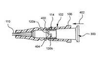 この形態における血液制御弁114の圧縮は、螺旋状の外側シェル116をゆがめることを可能にし、これによって内側弁部118を開いて流体通路404を作り出す。以下により詳細に論じられるように、特に内側弁部118を形成する係合部120a,120bが位置ずれし、ルアー器具300からカテーテルアダプター102の基端部104および装着されたカテーテル110を向く方向402に血液制御弁114を通る制御された流体の流れを可能にすることができる。  The compression of the