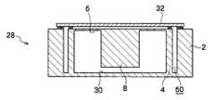 図3にはセンサ部28の断面図が示されている。センサ部28は例えば酸化Siなどの絶縁膜上に単結晶シリコン層を形成した SOI(silicon-on-insulator)基板であってもよく、図3に示すようにセンサ部28の上に配線基板32が接合され、一体化した構造とされている。センサ部28と配線基板32の接合方法としては例えばAu−Si共晶接合等を用いることができる。同様に底面シリコン基板30とセンサ部28もまたAu−Si共晶接合等を用いて一体化した構造とすることができる。  FIG. 3 is a cross-sectional view of the