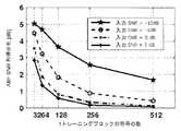 最初にシミュレーションで使用されたチャンネルモデルを説明する。60GHzのマルチアンテナABFの送受信機システムが室内環境において動作することが考慮される。各Tx/RxペアのCIRは、IEEE802.15.3cの標準化団体により提案されたCM23モデルを用いて生成される。その後、結果として得られたMIMOチャンネルは、平均受信電力がユニタリとなるよう正規化される。第1に、提案されたジョイントTx/RxABFアルゴリズムのBERパフォーマンスは、シングルキャリア(SC)QPSK−周波数領域イコライザ(FDE)エアインターフェースを用いて4×4のMIMO送受信機上で評価される。当該結果が図3に示される。本発明(xがマークされた実線)に係る手法がSISOシステム(実線)により6dBのABF利得を生じることが観察される。さらに、ジョイントTx/RxABFを適用することにより、当該BERパフォーマンスは、ABFがRxだけに適用された手法(円を有する破線)により3dBだけ改善される。第2に、提案されたCSI評価器のパフォーマンスは、当該イコライザの入力での平均ABFのSNRの劣化を完全なCSIの知識を用いたSNRと比較して計算することにより評価される。当該劣化は、トレーニングブロックの長さの関数として評価される。当該結果が図4に表わされる。512個のシンボルのブロックを用いて、当該劣化は、非常に低い入力SNR(−10dB)でさえ1dBよりも小さい。当該ブロック長が減少するにつれて当該劣化は、式(28)における近似により導入された誤差のため増加する。一方、当該入力SNRが増加するにつれて評価器のパフォーマンスは改善され、当該ABFのSNRの劣化は、−10dBの平均SNRに対して256個のブロック長を用いる0.1dBよりも小さい。Thesimulation results channel model used in the first simulation is described. It is considered that a 60 GHz multi-antenna ABF transceiver system operates in an indoor environment. The CIR for each Tx / Rx pair is generated using the CM23 model proposed by the IEEE 802.15.3c standards body. The resulting MIMO channel is then normalized so that the average received power is unitary. First, the BER performance of the proposed joint Tx / RxABF algorithm is evaluated on a 4 × 4 MIMO transceiver using a single carrier (SC) QPSK-frequency domain equalizer (FDE) air interface. The result is shown in FIG. It is observed that the technique according to the present invention (solid line marked with x) produces an ABF gain of 6 dB with the SISO system (solid line). Furthermore, by applying the joint Tx / RxABF, the BER performance is improved by 3 dB by the technique (dashed line with a circle) in which ABF is applied only to Rx. Second, the performance of the proposed CSI evaluator is evaluated by calculating the average ABF SNR degradation at the input of the equalizer compared to the SNR with full CSI knowledge. The degradation is evaluated as a function of the training block length. The result is shown in FIG. With a block of 512 symbols, the degradation is less than 1 dB even at very low input SNR (−10 dB). As the block length decreases, the degradation increases due to the error introduced by the approximation in equation (28). On the other hand, as the input SNR increases, the performance of the evaluator improves and the SNR degradation of the ABF is less than 0.1 dB using 256 block lengths for an average SNR of −10 dB.