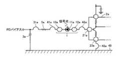 外部より供給されたバイアス電圧(PDバイアス)は、チップコンデンサ3a、ワイヤ31a、薄膜抵抗基板5a、ワイヤ41aを通じてPD素子1のカソード電極13aに印加される。チップコンデンサ3aはバイパスコンデンサとして機能し、バイアス電圧の変動に起因するノイズを抑制する機能を果たす。  A bias voltage (PD bias) supplied from the outside is applied to the