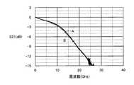図7は、本発明の実施の形態1による光受信モジュールの周波数特性の測定結果を示した図である。図7を参照して、グラフの縦軸はSパラメータ(S21)を示し、グラフの横軸は周波数を示す。この測定では、PD素子へ信号光を入射する光ファイバを入力、光受信モジュールの高周波出力端子を出力とした。ネットワークアナライザに、キャリブレーションを行なった光変調器を接続し、入力された光のパワーと、出力された電力との比較により、S21パラメータを測定した。2つの曲線A,Bは、カソード電極の長さが異なる2つのモジュールにそれぞれ対応する周波数特性を示す。図7は、薄膜抵抗の抵抗値に適切な差を設けることによって、各チャネルの周波数特性を一致させることができることを示している。  FIG. 7 is a diagram showing measurement results of frequency characteristics of the optical receiver module according to