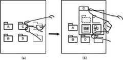場所に関する階層関係にあるファイルを表示する際、表示中のファイルに対して下に相当するファイルを下位レイヤとして重ねて表示し、2点を設置した座標を中心として、ピンチアウトした後のタッチ座標までの楕円形となる範囲を表示階層レイアウト生成部にてレイアウト透過領域と定義する。ピンチアウトした範囲に表示していたオブジェクトをレイアウト透過領域外に配置する。配置のレイアウトは配置前のオブジェクト座標とピンチアウトした後のタッチ座標の差分をもとに算出する。 When displaying a file that has a hierarchical relationship with respect to location, touch coordinates after pinching out centering on the coordinates where two points are placed, displaying the file corresponding to the lower layer as a lower layer over the displayed file The range that becomes an ellipse is defined as a layout transparent area in the display hierarchy layout generation unit. The object displayed in the pinched out area is placed outside the layout transparent area. The layout of the arrangement is calculated based on the difference between the object coordinates before arrangement and the touch coordinates after pinching out.