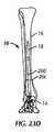 近位部分18aは、少なくとも1つの留め穴22を含む。一実施例では、釘18の近位部分18aは、係止留め穴、すなわち、静的留め穴222cを含む。このような実施例では、係止留め穴222cは、第3留め具20cを受け入れるように構成されており、第3留め具20cが釘18に対して実質的に移動しないような大きさを備えている。一実施例では、釘18の近位部分18aは、動的留め穴222dを含む。一実施例では、動的留め穴222dは、動的留め穴222dを通って延びる第4留め具20dに対して、釘18を近位方向に移動できるように、細長い。このような実施例では、以下に更に詳細に説明するように、第4留め具20dは、釘18が脛骨16に対して実質的に遠位方向に移動しないように、動的留め穴222dの近位端に向かって取り付けられる。ただし、所定量の近位方向への移動は、例えば、足首関節をさらに圧迫できるように、許容される。脛骨16に対して釘18を固定することが望ましいか否かに応じて、第3留め具20cおよび第4留め具20dのいずれか一方または両方が使用されてもよい。