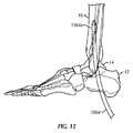 図10を参照すると、第1ガイドワイヤ軸線A7が所望の位置にきた後、第1ガイドワイヤ1060は、第1ガイドワイヤスリーブ542を通して第1ガイドワイヤ軸線A7に沿って近位方向に、踵骨12および距骨14を通して脛骨16の遠位端内に、前進する。一実施例では、撮像デバイスを使用して、第1ガイドワイヤ1060の配置および案内が監視される。一実施例では、第1ガイドワイヤ1060の案内は、側方から撮像デバイスを使用して、また、距腿関節窩撮影術を使用して監視される。一実施例では、第1ガイドワイヤ1060は、側面図および正面図のそれぞれにおいて、第1整合部材546dおよび/または第2整合部材546eと整合される。幾つかの実施例では、第1ガイドワイヤ1060を第1ガイドワイヤ軸線A7に沿って前進することにより、脛骨16の遠位端に、第1長さ方向軸線L1と実質的に整合したチャンネルを形成する。  Referring to FIG. 10, after the first guidewire axis A7 is in the desired position, the