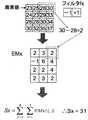 図10に、ステップS201にて実行する処理の概念図を示す。この図10において、4×4ブロックの大きさを持つエッジマトリクスx(EMx)の各要素値をEMx(i,j)とし、iは1以上の整数でx方向の位置を示し、jは1以上の整数でy方向の位置を示す。図10に示すように、例えば、画素値28及び31をそれぞれ有する2つの画素に対してフィルタfx={−1,+1}を施すことで、EMxの成分として30−28=2が得られる。また、EMxの12個の成分の和を取ることで、Sxとして31が得られる。  FIG. 10 shows a conceptual diagram of the process executed in step S201. In FIG. 10, each element value of the edge matrix x (EMx) having a size of 4 × 4 blocks is EMx (i, j), i is an integer of 1 or more and indicates a position in the x direction, and j is 1 The position in the y direction is indicated by the above integer. As shown in FIG. 10, for example, by applying a filter fx = {− 1, + 1} to two pixels each having