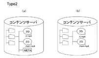また、図13は、上述の「タイプ4」の送信形態におけるコンテンツサーバのファイル構成例を概略的に示している。図13(a)は、メタ情報の挿入位置が第1の例である場合を示している。この場合、コンテンツサーバは、部分的に3Dコンテンツのファイル、サイマル2Dコンテンツのファイルと共に、メタ情報が挿入されたメタファイルを有している。一方、図13(b)は、メタ情報の挿入位置が第2の例である場合を示している。この場合、コンテンツサーバは、メタ情報が挿入された部分的に3Dコンテンツのファイル、サイマル2Dコンテンツのファイルを有するが、メタ情報が挿入されたメタファイルを有していない。 FIG. 13 schematically shows an example of the file configuration of the content server in the “