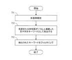 ステップ703では、キーワード登録プログラム121は、抽出されたキーワードのフィルタリングを行う。仮想フォルダ生成プログラム122による仮想フォルダ生成処理では、抽出されたキーワードをもとに仮想フォルダの生成が行われるため、仮想フォルダとして不適であるキーワードが含まれると、不適当な仮想フォルダが生成してしまう可能性がある。そのため、仮想フォルダとして不適と考えられるキーワードをこの処理で除外する。例えば「検収通知書1」というキーワードから仮想フォルダを定義する場合、ユーザにとっての分類のわかりやすさの観点から、数字は除外した方が望ましいと考えられる。なお、フィルタリングを実現するには、予め除外すべき文字や特殊な名詞を辞書やDBに登録しておき、それを参照して除外すべき文字か否か判断する。除外すべき文字としては、米印、矢印等の記号や、数字(ただし、数字はキーワードとして必要な場合もあるため、常に除外対象とするのは不適である。従って、最終的にユーザに除外するか否かについて確認するようにしても良い)。図8Cは、図8Bにおけるキーワードから数字を含むキーワードを除外した例を示している。また、名詞の中で特殊なパターンも除外すべきである。例えば、代名詞、ナイ形容詞語幹、一部の名詞接尾辞などである。ナイ形容詞語幹とは、「申し訳」、「大人げ」などの「〜ない」の形をとる名詞である。また、除外すべき名詞接尾辞としては、例えば、「〜君」、「〜さん」などの人名に続く敬称や、「休みがち」の「がち」や、「勝ったも同然」の「同然」などの形容動詞語幹などがある。  In