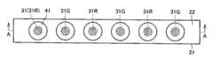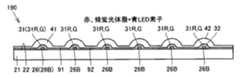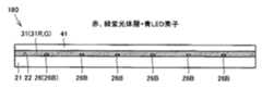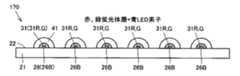 本実施の形態では、(青色で発光する青LED素子26B+赤色で発光する赤蛍光体層31R)の組み合わせと、(青色で発光する青LED素子26B+緑色で発光する緑蛍光体層31G)の組み合わせとが、交互に配置されている。  In the present embodiment, a combination of (