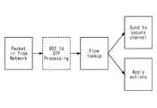 また、ネットワーク(NW)機器は、受信したパケットに対し、フローテーブル内に該当するエントリーが存在しない場合、このパケットを内部に保留し、セキュアチャンネル(Secure channel)を介して、コントローラに未知のパケットが到着したことを通知する(図2の「Send to secure channel」)。ここでは、該当するエントリーが存在しない場合の未知のパケットを1stパケット(First packet)と呼称する。 In addition, when there is no corresponding entry in the flow table for the received packet, the network (NW) device holds this packet internally, and an unknown packet is sent to the controller via the secure channel (Secure channel). Is notified ("Send to secure channel" in FIG. 2). Here, an unknown packet when the corresponding entry does not exist is referred to as a 1st packet (First packet).