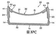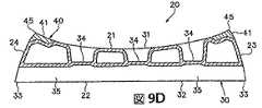 屈曲凹部35は、様々な内部結合部34の位置に対応する凹部を下側表面22に形成している。図9Dは、1つの屈曲凹部35を通る断面を示す。この領域に関して、内部結合部34は下に向かって延び、屈曲凹部35を規定する下部障壁層32の部分に上部障壁層31が接着されている。従来の袋状部材のいくつかは、屈曲点を形成する結合部を含み、これら屈曲点はその領域に流体クッションが存在しないために比較的硬い部分を形成する可能性がある。すなわち屈曲点は一般に、従来の袋状部材の非クッション領域を形成していた。従来技術における屈曲点とは異なり、屈曲凹部35は内部結合部34を屈曲凹部35に結合する領域に、袋状部材30の流体で充填された部分を形成する。言い換えれば、屈曲凹部35と上部障壁層31との間に流体を含む空間が形成され、それにより屈曲凹部35が屈曲を許容すると同時に地面反力の減衰特性を与えるという利点をもたらす。あるいはまた、屈曲凹部35を規定する区域内には内部結合部34を形成しなくてもよい。  The bent