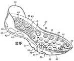 補強構造40は上側部分41、下側部分42および複数の連結部43を含む。上側部分41は大略的にU形の形状を示し、上側表面21と側面23および24との境界に位置する。したがって上側部分41は、外側面23に沿って前方領域15からかかと領域17に延び、かかと領域17の周囲に延び、更に内側面24に沿って前方領域15からかかと領域17に延びている。下側部分42もまた大略的にU形の形状を示し、下側表面22と側面23および24との境界に位置する。上側部分41は上側表面21と側面23および24の両方の部分とにわたって延びるが、下側部分42は側面23および24にわたって延びる。すなわち、下側部分42は下側表面22に隣接する側面23および24の部分を覆うが、下側部分42は一般に下側表面22にわたっては延びない。下側部分42はかかと領域17を通って延び、中間領域16内に延びていてもよい。しかし図示のように、下側部分42は前方領域15内には延びていない。連結部43は側面23および24に沿って延び、また上側部分41および下側部分42の間でも延びている。連結部43は上側部分41と下側部分42との間で、対角線方向に延びる。より具体的には、連結部43は前方に傾斜した形状を示すが、実質的に鉛直であっても後ろ向きに傾斜していてもよい。  The reinforcing
