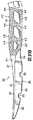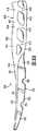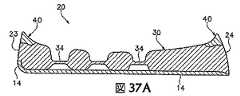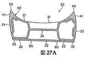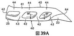 補強構造40は袋状部材30に埋め込まれており、補強構造40の外側表面が大略的に袋状部材30の表面21〜24と面一となっている。図9Fは履物の底要素20の一部の横断面図である。この横断面図に示すように、連結部43の外側表面は大略的に外側面23と面一である。ゆえに、外側面23は連結部43を収容する凹部を形成している。すなわち、外側面23は袋状部材30内方に向かってカーブして、その中に連結部43が配置される凹部を形成する。このようにして、補強構造40のそれぞれの外側表面は、袋状部材30の表面21〜24と概略面一となる。補強構造40の各外側表面を袋状部材30の表面21〜24と概略一面とすることにより、履物の底要素20に滑らかな外面形状を与えるという利点が得られる。しかし本発明のいくつかの実施形態では、補強構造40の外側表面は袋状部材30内に引っ込み、または袋状部材30から外側に突出していてもよい。  The reinforcing
