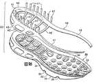 図1に示す履物10はアッパー11と履物の底構造12とを含む。アッパー11には複数の材料要素(例えば布、フォームおよび皮革)を含むことができ、これら材料要素は縫い合わせるか接着して、足をしっかりとまた快適に受け入れる内部の空洞を形成する。これら材料要素を選択してアッパー11との相対的な位置関係に配置することにより、例えば耐久性、通気性、耐摩耗性、柔軟性および快適性のような特性を選択的に与えることができる。更にアッパー11は、内部空洞の寸法を変更するような通常の仕方で使用されるレース(靴紐)を含み、それにより内部空洞の中に足を固定し、足の内部空洞に対する出し入れを容易にする。レースはアッパー11内の開口を通って延びることができ、アッパー11のベロ部分は内部空洞とレースとの間に延びることができる。そのためアッパー11それ自体は、本発明の範囲内でほぼ通常の形状を有することができる。  The