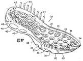 履物の底要素20は、上側表面21とその反対側の下側表面22とを含む。上側表面21は接着などの通常の仕方でアッパー11に固定され、足の裏の表面の形に適合するような形状とすることができる。そのため、上側表面21はかかと領域15の高さを前方領域15の高さよりも高くすることができ、中間領域16はそれらの間の高さの移行領域である。履物の底要素20の全体の厚みの差は、かかと領域15の高さが前方領域15よりも高いことに対応するものである。一般に履物の底要素20の厚みは、例えば前方領域15の先端部分での0.15インチから、前方領域15と中間領域16との境界での約0.70インチまで変化することができる。同様に、履物の底要素20の厚みは、かかと領域17内で、例えば0.70インチから、約1.20インチまで変化できる。In the following description, various general regions of