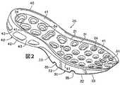 通常の運動用の履物は2つの主要な要素、すなわちアッパーと履物の底構造とを有する。アッパーは足を確実に収容し、履物の底構造に対して足の位置を定めるための足の覆いをなす。アッパーはまた、足を保護しかつ換気を行なうような構成を有し、それにより足を冷却して汗を除去することもできる。履物の底構造はアッパーの下面に固定され、一般に足と地面との間に位置する。地面反力の減衰特性に加えて、履物の底構造は地面を捕捉し、かつ過剰な回内運動のような足の動きを制御することもできる。これによりアッパーと履物の底構造とは互いに協働して、ウォーキングやランニングのような広範囲の脚の運動に適した快適な構造を与える。 Normal athletic footwear has two main elements: an upper and a footwear bottom structure. The upper securely holds the foot and provides a foot covering for positioning the foot with respect to the bottom structure of the footwear. The upper can also be configured to protect the foot and provide ventilation, thereby cooling the foot and removing sweat. The bottom structure of the footwear is fixed to the lower surface of the upper and is generally located between the foot and the ground. In addition to the ground reaction force damping characteristics, the bottom structure of the footwear can also capture the ground and control foot movements such as excessive pronation. Thus, the upper and the bottom structure of the footwear cooperate with each other to provide a comfortable structure suitable for a wide range of leg movements such as walking and running.