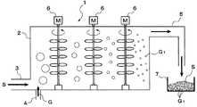 この装置1は、攪拌槽2の一端下部に粘性組成物Sの供給管3と、添加ガスGの供給管4が接続されるとともに、他端上部に粘性組成物Sの排出管5が接続され、かつ内部に上記一端から他端に向けて複数台の撹拌機6が配置されたものであり、攪拌槽2内は上述した予備冷却の温度に保持されている。Next, bubble nuclei are dispersed and formed in the viscous composition using the cell