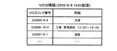 As shown in FIG. 5, the VICS information is composed of a VICS link number for identifying a link and detailed information indicating a traffic congestion degree, a traffic congestion length indicating a traffic congestion section, accident information, construction information, and the like. . For example, the VICS information shown in FIG. 5 is information that is generated for 5 minutes from 13:56 to 14: 1 on August 6, 2010, and is distributed at 14: 1. The VICS link number “533945- The link “4-4” indicates that the congestion degree is “congestion” in all sections. Further, it is shown that the vehicle regulation is performed by the construction between 13:00 and 18:00 for the link of the VICS link number “533946-10-2”. Further, it is indicated that the congestion degree is “congested” in all sections for the link having the VICS link number “533947-6-1”. When only a part of the link is a traffic jam, the VICS information also includes information on the coordinates of the traffic jam start point and information on the distance of the traffic jam section from the traffic start point.