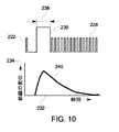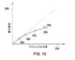 ここで図9〜12を参照すると、図9は、基準パルス222、プッシングパルス226及びトラッキングパルス228を有するパルスシーケンスを表している。参照番号224はプッシングパルス226の長さを意味している。グラフ230は標的部位の変位を表している。横軸232は時間を表しており、また縦軸234は標的部位の変位を表している。プッシングパルスの長さを徐々に短くするに連れて、グラフ240、246及び252のそれぞれに表したようにこれらのプッシングパルスにより誘導されるピーク変位が小さくなる。図示したように、プッシングパルス236は長さ238を有し、プッシングパルス242は長さ244を有し、プッシングパルス248は長さ250を有する。目下のところ企図される実施形態では、次のプッシングパルスが送達される前に、標的部位の変位を休止時の変位に戻るように落ちつかせている。  Referring now to FIGS. 9-12, FIG. 9 represents a pulse sequence having a