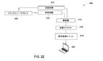 図22は、トランスジューサアレイ408を有する超音波撮像システム406を表している。トランスジューサアレイ408は1次元アレイとすることも2次元アレイとすることもある。トランスジューサアレイ408は1つまたは複数の標的部位を含む2次元面に導かれることがある。このトランスジューサアレイ408を用いて、基準パルス、プッシングパルス及びトラッキングパルスを送達させることがある。典型的にはトランスジューサアレイ408はパルスを送達させる間、対象と物理的に接触状態にある。パルスを送達するための送信回路410はトランスジューサアレイ408と動作可能に関連付けさせている。受信回路412は標的部位から情報を受け取るためにトランスジューサアレイと動作可能に関連付けさせている。送信回路410と受信回路412の両者は制御器414と電子的に結合させている。制御器414は、パルスシーケンス、プッシングパルスの可変パラメータ、並びにトラッキングパルスのPRF、プッシングパルスの送達後のトラッキングパルス送達までの時間など別の変数を制御する。さらに制御器414はトラッキング領域から受け取った情報の編成も行う。標的部位から受け取った情報は後で処理するために記憶デバイス416内に保存されることがある。一例としてその記憶デバイス416はランダムアクセスメモリを含むことがあるが、別の記憶デバイスを用いることもある。記憶デバイス416は標的部位の初期位置や標的部位の変位位置などの情報を保存するために使用されることがある。次いで信号処理ユニット418によって、記憶デバイス416内に保存しておいた情報が処理される。別法として信号処理ユニットは標的部位の画像を作成するために制御器414からの情報を直接使用することがある。処理済みの画像はモニターなどの表示デバイス420を用いて表示される。図示していないが、表示デバイス420の代わりに標的部位の変位の点計測のための計測デバイスを利用することもある。図22では、ある種の要素を省略してあることがあり、またある種の要素の機能を別の要素と合成させていることがある。例えば信号処理ユニット418は制御器414の一部として提供されることがある。  FIG. 22 represents an