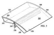 ここで主に図5を参照すると、閉鎖医療クッション246の別の実施形態が示されている。閉鎖医療クッション246は、クッション本体250を含み、このクッション本体には、第1側部253または第1外側部に第1閉鎖部252が、第2側部255または第2外側部に第2閉鎖部254がそれぞれ形成されている。第1および第2閉鎖部252は、ウィッキング材料ホルダ236に向けて上方に(図示の方向に対して)角度を付けた傾斜壁を有する。中心部268に関して、オーバレイ要素265またはオーバレイは、閉鎖部252および254を覆って保持するようにしてもよい。閉鎖部252および254の間隙は、ウィッキング材料238を保持するウィッキング材料ホルダ236を形成する。ウィッキング材料238の形状およびウィッキング材料238の物質は、下方の線形創傷(例えば、図1の線形創傷12)を乾燥させて清潔に保つのを補助するように機能することができる。  Referring now primarily to FIG. 5, another embodiment of a closed