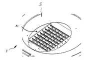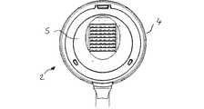 まず、図2および図3は、一般的に符号1によって示される照明装置である、本発明に基づく街路照明用の照明装置の実施の形態を示す。これらの図に図示された照明装置は、部分的に図解されているポスト(柱)3の上端に配設されている照明用ヘッド2を具備する。これらの図2および図3に図解された実施の形態において、照明用ヘッド2は、環状のハウジング4を有しており、当該ハウジングは、詳細を後述する新規な考案された照明用ユニットを収容している。ケーシング(ハウジング)4の底部の開口は、透明なカバーによって、たとえば、ガラス板5または他の透明な材料によってカバーされている(覆われている)。照明用ヘッド2の他の形状も用いることができ、本発明は図解した形状に限定されない。さらに、照明用ヘッド2を壁に直接装着することが可能である。2 and 3 show an embodiment of a lighting device for street lighting according to the present invention, which is a lighting device generally indicated by reference numeral 1. The illuminating device shown in these drawings includes an illuminating