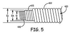 様々な実施形態では、1または複数のコイル層422、425、430は、その長さに沿って可変のコイルピッチを有しており、それは、外部に加えられる電磁放射(すなわち、MRIの胸部走査による)の影響を低減するために、コイル導体420をデチューンする(detune)ように働く。  In various embodiments, one or more coil layers 422, 425, 430 have a variable coil pitch along their length, which is applied to externally applied electromagnetic radiation (ie, MRI chest scans). In order to reduce the influence of the