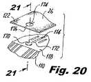 図18および19を参照すると、ステープルを含む挿入物110の遠位端部118およびカートリッジバットレス材料26の遠位端部122には、それぞれ、間隔を空けられたポスト162、164と間隔を空けられたホール166、168とが提供され得る。ポスト162、164およびホール166、168は、上記のポスト96、98およびホール100、102と実質的に同様に機能して、カートリッジバットレス材料26の遠位端部122を、ステープルを含む挿入物110の遠位端部118に固定する。  Referring to FIGS. 18 and 19, the