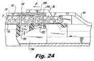 ここで、図24を参照すると、外科用ステープラー10は、まず、トリガ32をハンドル12に関して動かすことによって起動され(図1)、駆動装置36を、矢印Bの方向に、アンビル20の傾斜したエッジ40に関して動かし、それによって、アンビル20をステープルカートリッジ22に関して閉じた位置へと動かす。駆動バー194は、ステープルを含む挿入物194内を遠位に進むので、駆動バー194は、プッシャー192をステープル178のバックスパン182に対して上向きに追いやり、ステープル178を、カートリッジバットレス材料26、組織T、アンビルバットレス材料24を通して、アンビル20内のステープルうち曲げポケット44に向けて駆動する。組織を貫通する先端部188および190は、アンビル20内のステープル打ち曲げポケット44内で屈曲し、それによって、アンビルバットレス材料24を、組織Tに対して固定する。この間、バックスパン182は、カートリッジバットレス材料26を組織Tに対して固定する。  Referring now to FIG. 24, the