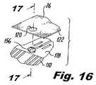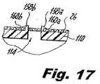 ここで、図16〜21を参照し、そして、最初に、図16および17に関して、バットレス材料を外科用機器のジョーに着脱可能に固定する代替的な方法が記載される。上記の突出部88に類似する、分割した突出部156は、ステープルを含む挿入物110の遠位端部118の上に形成され、そして、フランジ160aおよび160bを規定するキャップ半体158aおよび158bを備える。カートリッジバットレス材料26の遠位端部122内のホール120は、分割した突出部156の上にフィットし、カートリッジバットレス材料26の遠位端部122を、ステープルを含む挿入物110の遠位端部118に固定する。  Reference is now made to FIGS. 16-21, and initially with reference to FIGS. 16 and 17, an alternative method of releasably securing a buttress material to a jaw of a surgical instrument is described. A