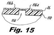 図11および15の場面を参照すると、カートリッジバットレス保持システム30は、ステープルを含む挿入物110の遠位端部118に形成されたポスト116を備える。ポスト116は、上記のポスト76と類似しており、そして、半体116aと116bとに分割しており、組織およびカートリッジバットレス材料26を切断するためのナイフブレードの通過に適合する。カートリッジバットレス材料26は、対応するホール120を備え、このホール120は、カートリッジバットレス材料の遠位端部122に形成され、そして、ステープルを含む挿入物110上のポスト116の上にフィットするように構成される。  Referring to the scene of FIGS. 11 and 15, the cartridge buttress