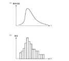 分布情報入力手段302は、先行列車101が閉塞区間Bを抜ける時刻Tの分布情報、すなわち様々な時刻区間に対し、Tが前記時刻区間に含まれる確率情報を出力する。この確率情報は、例えば図5(a)のような確率密度として与えてもよいし、図5(b)のように頻度のヒストグラムとして与えてもよい。この情報は、実際の運行において時刻Tがいつであったかを長期間履歴をとり、それに基づいて決定してもよい。列車状態入力手段303は、後続列車103に設置され、少なくとも車両の速度及び位置、ATC信号情報を取得し、出力する。最適化パラメータ記憶手段304は、少なくとも閉塞区間の境界位置を記憶しており、また、状況に応じて路線の駅位置や勾配を記憶しており、要求に応じて出力する。最適化手段305は、前記分布情報入力手段302、列車状態入力手段303によって出力された列車情報を用い、必要に応じて最適化パラメータ記憶手段304に記憶された情報を参照しながら、所定の評価指標の期待値を最適にするような列車制御指令を計算する。ここで、列車制御指令とは、例えば各時刻における目標速度、目標加減速度、ノッチ段などを指す。制御指令出力手段306は、前記最適化手段305によって得られた列車制御指令に従い、走行計画を作成して出力する。そして、このようにして作成された走行計画が、実際の列車の自動制御や運転士への列車運転支援に用いられる。  The distribution information input means 302 outputs the distribution information at the time T when the preceding train 101 passes through the block section B, that is, the probability information that T is included in the time section for various time sections. This probability information may be given as a probability density as shown in FIG. 5A, for example, or as a frequency histogram as shown in FIG. 5B. This information may be determined based on a long-term history of when the time T was in actual operation. The train state input means 303 is installed in the succeeding train 103, and acquires and outputs at least the speed and position of the vehicle and ATC signal information. The optimization