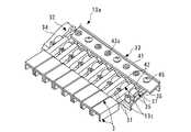 シャーシ後部13の鍵支持部13aは、シャーシ後部13自体に直接設けられたシャーシ側鍵支持部32(取付け部)と、このシャーシ側鍵支持部32に着脱自在に取り付けられた支点軸受部材33などで構成されている。図3および図4に示すように、シャーシ側鍵支持部32は、平面形状が横長矩形状でかつ前下がりに傾斜するガイド面34(載置面)と、このガイド面34上に互いに左右方向に所定間隔を隔てて並設された複数(図4では9つのみ図示)の鍵仕切支持部35(第1支持部)とを有している。  The