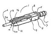 フェルールの調整を可能とする目的で、上述した配置構成によれば、フェルール3が固定ニップル5に向けて(図1の観点)軸方向後方に押さえられることにより、フェルール3が外部シェル2の内部に退避されて、圧縮ばね4により提供される外部の付勢力を克服することができる。フェルール3が軸方向後方に充分押し入れられてリミッタ11 から解除されると、フェルール3は、回転することができ(この場合、4箇所の異なる位置全体に対して90゜増加)、ここでフランジ12の異なるフラットは、適当な調整道具(図10Aに図示される)を用いてリミッタ11と接触するようになる。  For the purpose of enabling adjustment of the ferrule, according to the arrangement described above, the ferrule 3 is pressed toward the fixed nipple 5 (in view of FIG. 1) in the axial rearward direction, so that the ferrule 3 is inside the