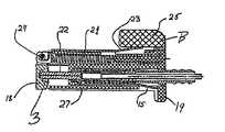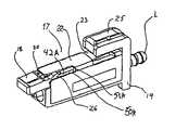 逆に、シャッター18の退避は、フェルールアセンブリ3に対する接近を開放し(図1参照)、したがってフェルールアセンブリ3は、反対側からアダプタ28の内部に導入されている同一の第2モジュラーコネクタ(図示せず)との物理的な端部間の作動可能な接触により係合され得る。このようなシャッター18の退避プロセスは、図4Bに図示されている。アダプタ28からモジュラーコネクタ17を解除するために、ノブ25が押下され、ラッチ23が速かにほぼ水平に置かれ、それにより、コネクタ17がアダプタ28との係合から解除され、2つのばね:(1)シャッター圧縮ばね21(図4A参照)および(2)圧縮ばね4(図1参照)により、アダプタ28からわずかに押退される。  Conversely, retracting the