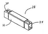 図5は、その端部に2つのアパーチャー29および30を有するアダプタ28を図示し、前記2つのアパーチャーには、2つのモジュラーコネクタ17(図3A参照)が挿入されるようになっている。図5はまた、EMI遮蔽だけでなく内部部品のホルダおよびカバーとして機能する外部シェル31を図示する。図6は、シャッター35および36、外部シェル31、およびばね32が除去されたアダプタ28の分解図である。図6はまた、2つのカム33および34を外部に付勢するS字状のばね32を図示し、前記2つのカムのそれぞれは、垂直に搭載されたシャッター35および36の端部に個別的に取り付けられている(図7参照)。本実施形態において、シャッター35および36のそれぞれは、垂直回転軸を有する。モジュラーコネクタ17がアダプタ28の収容アパーチャーの内部に挿入されていないと、ばね付勢されたカム33および34は、ばね32により押さえられ、したがってシャッター35および36は、閉位置に回転し、前記閉位置は、図9に図示された光軸または長手方向軸に対して実質的に垂直である。  FIG. 5 illustrates an