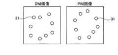 一方、例えば、Diffusion画像やPerfusion画像などの機能画像は、一般的に画像にひずみが生じるため、単純に患者座標に基づいて位置合せを行うのは難しい。そこで、例えば、位置合せ処理部26aは、各画像から特徴的な部位を示す領域を抽出し、抽出した領域を基準にして位置合せを行う。図3−1〜3−5は、本実施例1に係る位置合せ処理部26aによる画像位置合せ手法の一例を説明するための図である。なお、ここでは、DWI(Diffusion Weighted Imaging)画像とPWI(Perfusion Weighted Imaging)画像とを位置合せする場合について説明する。  On the other hand, for example, functional images such as diffusion images and perfusion images are generally distorted, and it is difficult to simply perform alignment based on patient coordinates. Therefore, for example, the