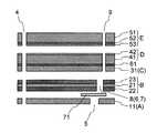 本発明に係る被検体分析用チップは、前記A部材、メンブレンフィルター、B〜E部材を下からこの順序に積層した後、位置決め孔4が穿孔されてなる。図5は、図1に示した被検体分析用チップの層構成を示した斜視図である。以後、図5と図3を併用しながら本発明に係る被検体分析用チップの製造方法について説明する。  The analyte analysis chip according to the present invention is formed by laminating the A member, the membrane filter, and the B to E members in this order from the bottom, and then the