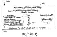 図19B(1)は、投票数の列の表示を示している典型的なスクリーンショットである。ディスプレイ1900aは、現在再生している楽曲1902およびその進行1904を示している。現在再生している楽曲1902の進行1904は、例えば、残り時間を表す数値、スライドバー等のような如何なる態様で表示されてもよい。アーティストおよび楽曲のリスト1906は、それぞれの投票数に基づいて投票数エリア1908aに表示されるのが好ましい。あるいは、ユーザエリア1910は、例えば、楽曲をリストに掲載しているユーザ、最後に楽曲に投票したユーザ、楽曲を再生させようと「対戦している」グループ名等のような、楽曲に投票しているユーザについての情報を表示してもよい。  FIG. 19B (1) is a typical screenshot showing the display of the vote count column. The